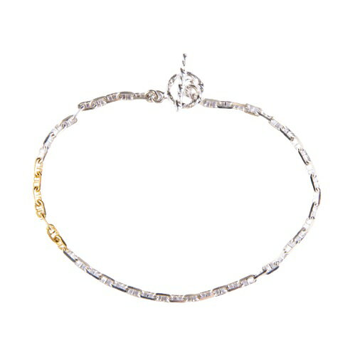 RELAX をメインテーマとして掲げ、 素材美を生かすハンドメイドアクセサリーブランド Atease(アティース)。 イカリに使用されるマリーンチェーンのブレスレット。 コンテンポラリー系の要素とモードよりの要素を併せ持つ大人っぽいデザインです。 チェーンは白仕上げのシルバーで、一部をゴールドコーティングにし、バイカラ―になっています。 マルカンとTバー仕様です。 旧作よりチェーンが細くなって新バージョンとして再リリースです! Marine chain bracelet made of 925 silver. It is an adult-like design that combines contemporary elements and mode elements. The base is a white finish silver and part of the chain is gold coating. ■素材:チェーン=シルバー925(一部ゴールドコーティング) ■実寸:全長約19.5cm=内径約19cm用。通常メンズ推奨。 ■実寸:全長約17.5cm=内径約17cm用。通常レディース推奨。 ■長さ指定希望の場合は購入時に備考に記載ください。延長は5cmまで+1100円税込みです。