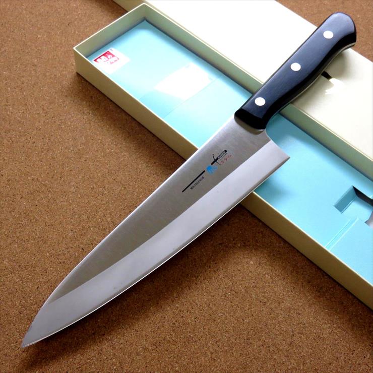 商品詳細 メーカー:井之口刃物製作所 ブランド:TSマダム アイテム名:スジ牛刀 数量:1本 製造元:岐阜県関市 サイズ 全長:約320mm 刃部:約200mm 刃幅(刃元部):約48mm 刃厚(峰刃元部):約2.4mm 重量:約170g 材質 刃部:クロムモリブデン鋼 AUS-8 柄部:積層合板