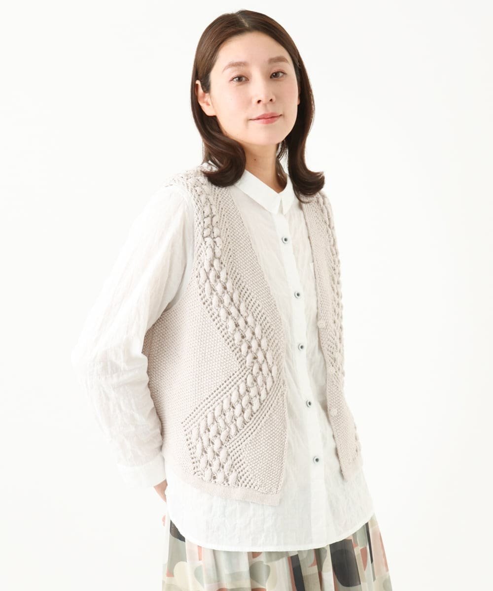 GIANNI LO GIUDICE(ジャンニロジュディーチェ)[洗える]透かし編みGAUSSニットベストコットン100%の清涼感のある肌触りのかぎ編みニットベスト■デザインカギ針風の編地は、ポップコーン編みなど表情のある楽しい組み合わせの編地を、ジャンニロらしいベストデザインに仕上げました。ベストの雰囲気に合わせたくるみボタンもポイントです。■素材空紡コットンの糸表面にドライチュニカ加工(樹脂コーティング)を施した糸の素材です。春から初夏のニット製品に適した清涼感のある肌触りが得られるドライチュニカ加工は、糸にシャリ感が与えられ、樹脂の貼りは編目をより立体的に表現されます。また、毛羽が抑えられて、クリアな表情に加工された素材です。■スタイリング・おすすめポイント表情のあるベストは着合わせにアクセントとなること間違いなし。シンプルなブラウスやカットソーに合わせるだけでこなれ感のあるスタイリングに仕上がります。ニットならではのカラーバリエーションもポイント。1点投入で華やかさのあるブルーはオススメカラーです。同素材で半袖プルオーバー[NGFEB50250]もございます。------------------------透け感:あり伸縮性:あり光沢感:なし裏地:なし生地の厚さ:普通------------------------model:H168B78W60H87着用サイズ:M※自然光・照明の関係、パソコン・スマートフォンなどの環境により、実際と色味が違って見える場合がございます。予めご了承ください。商品の色味は、詳細画像をご参照ください。型番:NGSEB50250-80-040 NU9073【採寸】サイズ着丈身幅肩幅M48cm48.5cm37cm商品のサイズについて【商品詳細】中国素材:コットン 100%サイズ:M手洗い可|ドライクリーニング|ウェットクリーニング※画面上と実物では多少色具合が異なって見える場合もございます。ご了承ください。商品のカラーについて 【予約商品について】 ※「先行予約販売中」「予約販売中」をご注文の際は予約商品についてをご確認ください。■重要なお知らせ※ 当店では、ギフト配送サービス及びラッピングサービスを行っておりません。ラッピング・ギフト配送について同時に複数の商品を注文された場合メーカー希望小売価格についてご利用ガイドGIANNI LO GIUDICE(ジャンニロジュディーチェ)[洗える]透かし編みGAUSSニットベストコットン100%の清涼感のある肌触りのかぎ編みニットベスト■デザインカギ針風の編地は、ポップコーン編みなど表情のある楽しい組み合わせの編地を、ジャンニロらしいベストデザインに仕上げました。ベストの雰囲気に合わせたくるみボタンもポイントです。■素材空紡コットンの糸表面にドライチュニカ加工(樹脂コーティング)を施した糸の素材です。春から初夏のニット製品に適した清涼感のある肌触りが得られるドライチュニカ加工は、糸にシャリ感が与えられ、樹脂の貼りは編目をより立体的に表現されます。また、毛羽が抑えられて、クリアな表情に加工された素材です。■スタイリング・おすすめポイント表情のあるベストは着合わせにアクセントとなること間違いなし。シンプルなブラウスやカットソーに合わせるだけでこなれ感のあるスタイリングに仕上がります。ニットならではのカラーバリエーションもポイント。1点投入で華やかさのあるブルーはオススメカラーです。同素材で半袖プルオーバー[NGFEB50250]もございます。------------------------透け感:あり伸縮性:あり光沢感:なし裏地:なし生地の厚さ:普通------------------------model:H168B78W60H87着用サイズ:M※自然光・照明の関係、パソコン・スマートフォンなどの環境により、実際と色味が違って見える場合がございます。予めご了承ください。商品の色味は、詳細画像をご参照ください。型番:NGSEB50250-80-040 NU9073【採寸】サイズ着丈身幅肩幅M48cm48.5cm37cm商品のサイズについて【商品詳細】中国素材:コットン 100%サイズ:M手洗い可|ドライクリーニング|ウェットクリーニング※画面上と実物では多少色具合が異なって見える場合もございます。ご了承ください。商品のカラーについて