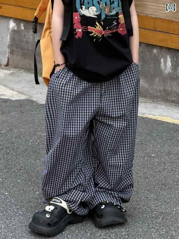 長ズボン キッズ おしゃれ パンツ 男の子 夏 チェック柄 ワイド ストレート ゆったり 虫よけ 蚊よけ ロング