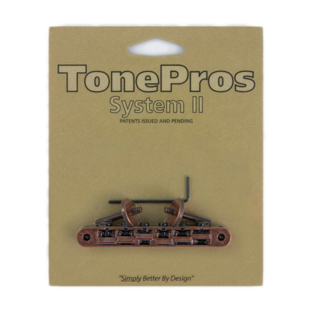 TonePros AVR2-AB Replacement ABR-1 Tuneomatic アンティークブロンズ ギター用ブリッジ※サイズ間違いなどがございませんように、サイズを測ってからのご注文をお願い致します。※ギターパーツの取り扱いには、相応の技術と知識が必要になります。自己責任にて取り扱い可能な方のみ、ご検討下さい。取り付け時に起った、楽器及びパーツの破損・損傷等につきましては当店は保証出来ません。あらかじめご了承下さい。※取り付け作業後の商品につきましては、いかなる理由でも返品は受付出来ません。AVR2は、ABR-1スタイルのブリッジの代替品です。ほとんどのUSA製ギターのABR-1スタイルブリッジに適合します。サドルは溝加工無し仕様になっています。弦高、イントネーション調整後、ブリッジ本体とスタッドをイモネジで固定する独自の特許取得済み「SystemII」構造により、ブリッジのがたつきがなくなり弦の振動をしっかりボディーに伝え、イントネーション、サスティンが向上します。またリテーナーワイヤー仕様により、弦交換時等にサドルが外れるのを防ぎます。ブリッジが固定されている事で、弦交換の際ブリッジが外れる事がなく弦交換前のイントネーション、弦高が保たれます。【注意点】図面を参照し、サイズを確認して下さい。ToneProsをギター本体へ加工無しで取り付けができない場合は、楽器店、リペアショップ等にご相談して頂くようお願い致します。無理に交換・取り付けをすることによって、ギターに損傷・故障、また思わぬ怪我をする場合があります。そのような場合、当社ではTonePros商品の不具合以外は保証できかねますのでご了承ください。【Specs】Radius: 約304.8mm / 12” ※1弦ー6弦のサドルのRSaddle material: BrassWrench: 1.5mmAB:アンティーク・ブロンズ