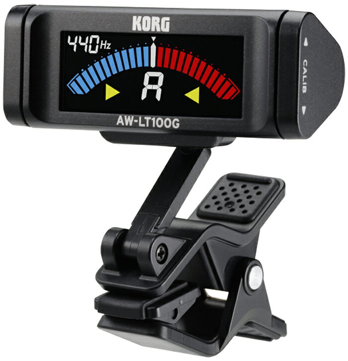 KORG AW-LT100G ギター専用 クリップチューナー100時間の連続駆動。クリップ型チューナー、 ギター/ベースそれぞれ専用にラインナップ。楽器に直接取り付けて手軽にチューニングできる、コルグのクリップ型チューナー。ギター専用のAW-LT100G、そしてベース専用のAW-LT100Bが登場です。AW-LT100G / Bは、単4形乾電池の採用により約100時間という圧倒的な長寿命を実現。ボディは軽量設計で、三角形のシャトル・スイッチが直感的なオペレーションを可能にします。またコルグ・チューナーとしては初のギター専用、ベース専用モデルをラインナップ。それぞれ無駄一つない専用回路が、メーターの反応速度をさらに高めています。さらに、AW-LT100Bでは低音を検知する感度を強化し、多弦ベースでのチューニングも完璧にフォロー。あらゆるニーズに合わせてセレクトできるコルグの豊富なチューナー・ラインナップに、また新たな個性が加わりました。【特徴】・単4電池1本で連続100時間の長時間動作。・さらなる軽量化を実現。・メーター速度がアップしたギター専用のAW-LT100G。・色鮮やかなカラーLCDで高い視認性を確保。・3種類のメーター・ディスプレイ・モードを切り替え可能。・±0.1セントの超高精度チューニングに対応。・左右のシャトル・スイッチで簡単操作。・高いホールド感と柔軟性を備えたクリップ構造を採用。・キャリブレーション、オート・パワー・オフ、メモリー・バック・アップ機能を搭載。■連続100時間の長時間動作。AW-LT100G / Bは、従来のクリップ型チューナーで数多く使われているコイン電池ではなく、よりお求めやすく、電池容量も大きい単4形乾電池1本で動作。アルカリ乾電池使用時にはなんと約100時間もの連続動作が可能です。コイン電池使用モデルと比較すると数倍ものロングライフ設計で、非常に高いコスト・パフォーマンスを実現。電池交換の必要なく長期間使い続けることできます。■単4電池使用ながら、さらに軽く。コイン電池より遥かに重い単4電池を採用しているにも関わらず、ボディ本体をより一層軽量化したことで、さらなる軽量感を実現。電池込みでわずか32gという軽さで、ギター、ベースに取り付けたままでも違和感なく快適な使い心地を提供します。■メーター速度がアップしたギター専用のAW-LT100G。ギター専用モデルの AW-LT100Gは、Sledgehammer Pro / Sledgehammer Custom 100と同様にクロマチック・モードを採用し、ギター・チューナー専用として最適化された回路設計により、メーターの追従性や安定性、反応速度の向上を実現しています。■色鮮やかなカラーLCD。高い視認性を誇るVA型カラーLCDディスプレイを採用しました。高輝度ホワイト・バックライトとカラーLCDメーターで、高コントラスト+広視野角を実現。チューニングの状態を鮮明に表示します。■±0.1セントの超高精度チューニング。AW-LT100G / Bはストロボ・モード時、±0.1セントまでの超高精度チューニングが可能。常に完璧なチューニングでの演奏が求められるレコーディングやステージの現場においても、ピッチの細かな誤差まで追い込むことができ、プロフェッショナルなニーズにも確実に応えます。■3種類のメーター・ディスプレイ・モード。プレイヤーのスタイルに合わせ、3種類のメーター表示方式から選択可能。オーソドックスな「レギュラー・モード」のほか、メーターが流れる方向と速度でピッチの変化を示し、細かな誤差まで視認しやすい「ストロボ・モード」「ハーフ・ストロボ・モード」を搭載しています。■簡単操作のシャトル・スイッチ。AW-LT100G / Bは、片手で直感的に操作できる、分かりやすいインターフェイスを採用。左右に配置された三角形のシャトル・スイッチを、上下に軽くカチッと回すだけで、電源のオン/オフから表示モードの切り替え、キャリブレーションの設定まで、全ての操作がストレスなくスムーズに行えます。■高いホールド感と柔軟性を備えたクリップ構造。接地効率を極限まで高めた形状のクリップにより、高いホールド感を実現。様々な厚みのヘッドのギター/ベースにしっかりフィットします。また可動アームとボール・ジョイントの二重機構により、自由な角度と耐久性を同時に実現。プレイヤーの好みのポジショニングに合わせてフレキシブルに対応します。■キャリブレーション、オート・パワー・オフ、メモリー・バック・アップ機能。様々なコンサート・ピッチに対応するキャリブレーション機能や、オート・パワー・オフ機能、メモリー・バック・アップ機能など、あらゆる角度からチューニングをサポートします。【AW-LT100G 仕様】音律:12平均律測定範囲(サイン波):B1(61.74Hz)〜 E6(1319 Hz)測定精度:±0.1 セント以内(ストロボ・モード)基準ピッチ範囲:A4 = 436 〜 445Hz(1Hz単位)ディスプレイ・モード:レギュラー/ストロボ/ハーフ・ストロボ電源:単4形乾電池×1本電池寿命:100時間(バックライト:ソフト、A4入力、連続動作時、アルカリ乾電池使用時)外形寸法:60(W)x 60(D)x 55