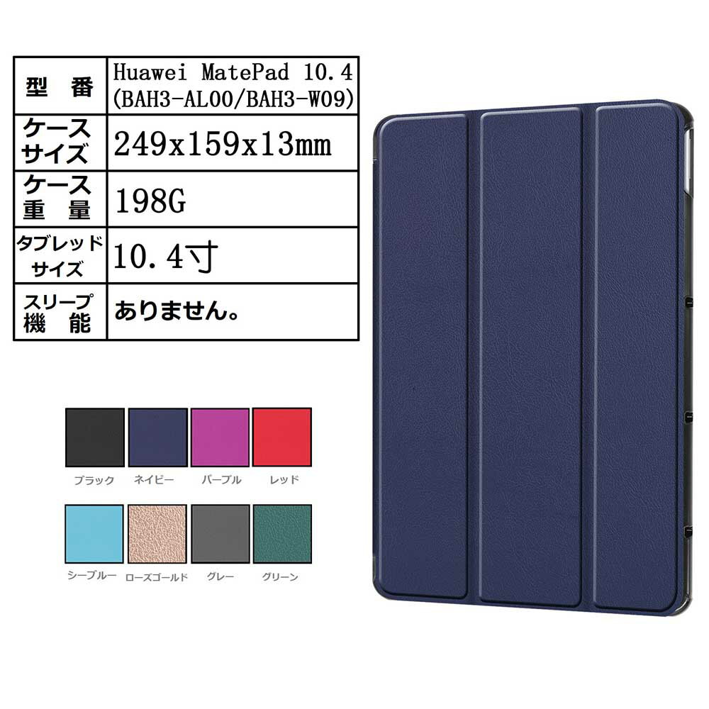 【送料無料】Huawei MatePad 10.4 BAH3-W09/BAH3-L09専用ケース マグネット開閉式 スタンド機能付き 三つ折 カバー 薄型 軽量型 スタンド機能 BAH2-W19 PUレザーケース 商品説明 ケース外皮は高品質PUレザーを使用しております、ケース内側素材は高級フェイクスウェード(レンズクロスに近い素材)を使用しており本体を優しく守ります。 カバー外部は高級PUレザーで、内部材質はマイクロファイバーです。磁性閉め機能付いております。 本体だけでなく液晶全面も保護する手帳タイプ。大切なタブレットを傷、汚れから、しっかり保護します。 ケースの素材の変更、縫い片などを新たに設計し、品質の向上を行いました!なので長い期間使えるケースになりました。 ☆各種ボタンやジャック類はケースに装着したままご使用になれます。 ☆カメラ撮影も音量調節もケースを装着したままでOKです。 ☆折りたたむとスタンドとして使用できます。 ☆動画視聴に便利な横置きと、メールや読書に最適な平置きに対応しています。 ☆ケースの開閉はマグネット式なので、片手で簡単に開閉できます。 商品詳細 適用機種 HUAWEI MatePad 10.4 BAH3-W09 (Wi-Fiモデル); BAH3-L09 (LTEモデル) 発送方法 ゆうメール 送料 送料無料 但し、代引きご指定された場合は送料と代引き手数料を別途請求いたします。 注意事項 人気カラーは集中注文予想され、在庫切れの場合は1週間ほど、お待ちしていただく場合がございます。ご了承くださいませ。【送料無料】HUAWEI MatePad 10.4 タブレット専用ケース マグネット開閉式 スタンド機能付き 三つ折 カバー 薄型 軽量型 スタンド機能 HBAH3-W09 ; BAH3-L09 PUレザーケース