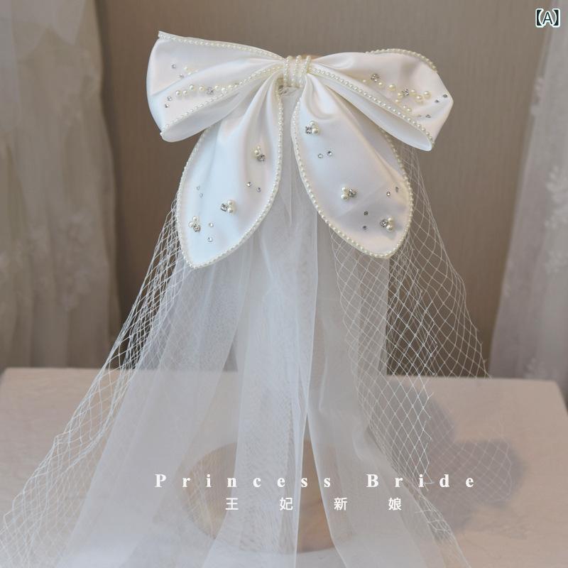 ヘッドドレス レディース ウェディングベール リボン パール プリンセス サテン ラインストーン ロマンチック 花嫁 ブライダル 結婚式 披露宴 前撮り ナチュラル レトロ アンティーク調 ショート丈 ホワイト 髪飾り