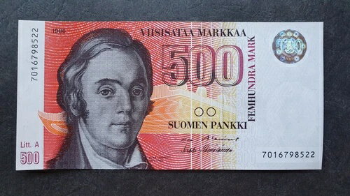 フィンランド 500 マルカー 1986、aUNC、P120、リット A (アレニウス、ハマライネン)