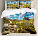 【中古】【未使用・未開封品】ファームHouse装飾布団カバーセットby Ambesonne、Abandoned House Into Wilderness by川on hillside with Stones Highland風景、装飾寝具セット