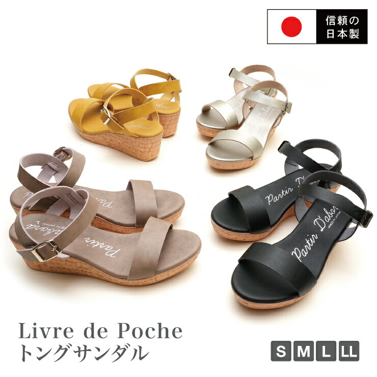 安心・高品質の日本製。 丁寧に縫製されたこのサンダルは普段使いはもちろん、リゾート、旅行にも活躍します。 アッパーには肌触りが良い人工皮革を使用。 素足でも痛くなりにくく快適な履き心地。 高反発クッションインソールで疲れにくい。 ストラップは一部がゴムになっているので脱ぎ履きしやすく、足をしっかりホールドし脱げにくい。 約5.5cmのウェッジソールで歩きやすく、美脚効果も期待できます! [原産国]:MADE IN JAPAN(日本) [素材]:アッパー/人工皮革、アウトソール/合成底 [サイズ]:S(22.0-22.5cm)、M(23.0-23.5cm)、L(24.0-24.5cm)、LL(24.5-25.0cm) [足囲]:表記なし(2E相当) [ソール高さ]:約5.5cm [重量]:Mサイズ片足で約230g [配送重量]:約650g