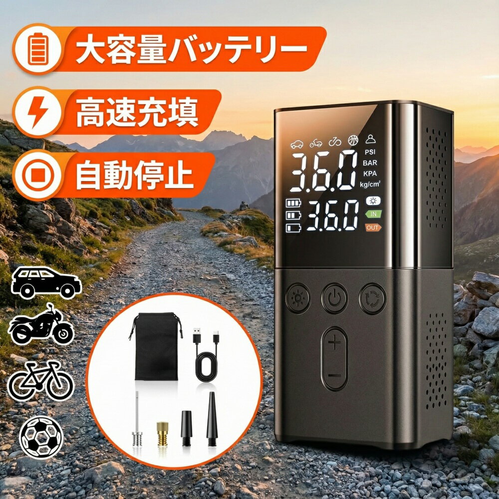 2025年全新モデル~航空機級アルミ合金ボディが登場! キャンプに、日常のタイヤメンテナンスに、緊急時のパンク修理に、お子様のプール遊びに――あらゆる「空気を入れたいシーン」で大活躍する一台ができました。スタイリッシュなデザインとハイスペックな性能で、どんな場面でもあなたの頼もしい相棒になります。 【LCDデジタル表示&4単位切り替え機能】 見やすいLCD画面で空気圧をリアルタイム表示!設定値も高精度で確認できるから、タイヤの状態が一目瞭然。ワンタッチで「PSI」「BAR」「KPA」「kg/cm²」の4単位を自由に切り替え可能。圧力単位や充電残量、設定値や現在値もすべて画面表示で、見やすくて操作もカンタン! 【大容量6000mAh&Type-C急速充電】 コードレス&大容量バッテリーで外出先でもサッと登場。電源がなくても持ち運べて便利!ドライブや旅行中の緊急メンテナンスにぴったり。Type-C対応で充電もラクラク、すぐに充電できるから「いざという時」も安心です。 【高精度空気圧測定&自動停止機能】 設定した空気圧になると自動停止!最大150PSIまで対応で、空気入れすぎを防止します。車、バイク、自転車など、様々なタイヤに最適な圧力設定が可能。4つのモード(車36PSI・バイク32PSI・自転車45PSI)搭載で、用途に合わせてお選びいただけます。コンパクトサイズで車のトランクやバッグにもすっきり収納! 【多機能LEDライト&高性能放熱設計】 充実の3モードLEDライト(白色点灯/赤点滅/赤高速点滅)で、暗い場所での作業も安全サポート!Type-C充電ポートはゴムカバー付きで防塵対策もバッチリ。側面の放熱孔と内部冷却機能で、長時間連続使用でもオーバーヒートしにくい耐久設計です。 【商品情報】 ・サイズ:8.0*4.4*12.5cm ・最大圧力:150PSI ・重量(電池除く):約480g ・バッテリー:6000mAh ・材質:航空機級アルミ合金 ・騒音レベル:約75dB ※使用中は大きな音(うるさい掃除機位)が出ますので、室内で試しにスイッチを入れる際は、ご注意ください。屋外でしたら気にならない音量です。 ・付属品:本体*1、USB充電ケーブル*1、ノズル*5、収納袋*1 【ご注意】 ※煙が出る(熱くなる)原因は長時間の連続使用が挙げられます。長時間使用するとモーターが発熱し、本体が熱くなる場合がございます。そのため、連続使用については避け、休ませることで寿命を延ばすことが可能です。3-4分間停止してから再度使用するようにしていただけると、商品がより長持ちいたします。