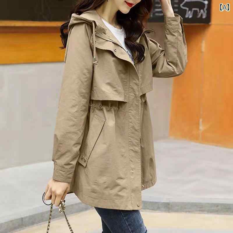 風衣 レディース ミドル丈 春秋冬 カーキ色 黒 ブラック ゆったり フード付き ウエスト絞り ポリエステル アウター