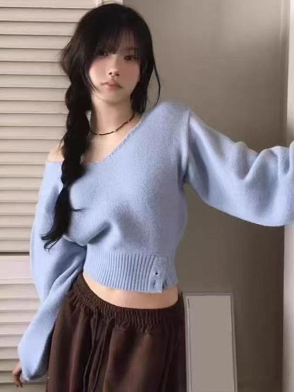 ニット レディース Vネック プルオーバー 韓国風 秋冬 無地 ボタン 伸縮性 ゆったり 長袖 トップス 黒 ブラック グレー 杏色 ブルー