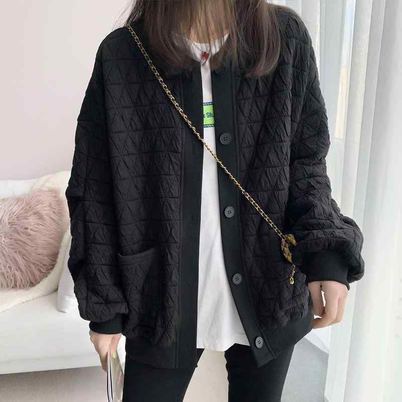 カーディガン レディース 春 韓国風 ゆったり 大きめサイズ キルティング 野球服風 スウェット トップス 長袖 ブラック ホワイト イエロー系