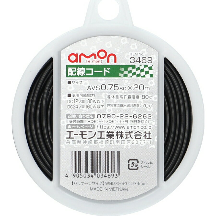 エーモン 3469 配線コード 黒色 AVS0.75sq×20m|トラック用品 カー用品 電装 配線 配線コード エーモン