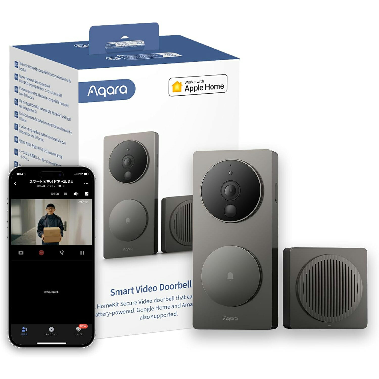 この商品について 【来客時の快適性が上がる!】1080p FHD解像度・95dBまでの音量・162度超広角視野・940nm赤外線ナイトビジョンを備えております。また、Alexa、Apple HomeKit、Google Assistant、Aqara Homeアプリに対応しています。センサーを活用してお宅をスマートに連動していきます。例えば、侵入、振動、水漏れなどをセンサーが検知すると、大音量のサイレンが鳴ります。※本製品では2.4GHzのWi-Fiが必要です。 【AI顔認識・PIRモーション検知と即時通知】AIベースの顔認識は、最大30人の顔をローカルに保存可能です。例えば、お母さんが帰ると「お母さん、お帰りなさい~」とカスタマイズされた音声が流れます。また、見知らぬ顔を検知すると、スマホに即時通知が届きます。 【音声変更・24時間録画】双方向通話では、オリジナルの音声だけでなく、ロボット、おじさん、またはピエロの声に変更可能です。例えば、宅配便が届いたとき、「玄関に置いてください」とおじさんの声で返事します。一人暮らしにも対応しています。24時間365日録画(※有線電源チャージのみ利用可能)で、玄関の様子をいつでも確認できます。最大7日間のクラウドストレージが付属し、最大512GBのマイクロSDカード(別売)もサポートしています。 【プライバシー保護・アラーム警報】隣のアパート/集合住宅にお住まいの方々のプライバシーを守るため、カメラのシーンにはエリアも選択してカバーすることができます。見知らぬ顔や不審な動きを検知すると、アラーム警報が作動します。室内機と室外機の両方で来客通知音を鳴らすことができるため、オートメーションにも柔軟に対応できます。 【長い寿命・初心者向けの取扱】両面テープ/ネジで貼って取り付けます。また、バッテリー(4か月バッテリー寿命)と電源ケーブルが付属し、電池式・有線チャージ、両方の利用が可能です。※暴力的な破損が検出されると、自動的に警報が鳴り、メッセージが送信されます。素早く簡単にドアの訪問者を知らせする 内蔵のAIベースの顔認識アルゴリズムにより、Aqara Homeアプリで家族や頻繁に訪問する人の顔を登録でき、誤報や通知を削減できます。 また、他のAqara 子デバイスに接続した場合、利便性やセキュリティのため、特定の顔や未知の顔の認識が自動返信の設定やスマート・ホーム・オーメーションのトリガーとして構成できます。ネットに繋がらない場合でも機能します。 ホームキット・セキュア・ビデオを使用したマルチエコシステムのサポートと強化されたセキュリティ 真にバッテリー駆動のビデオドアベルとして、すべてのデータはiCloudに保存される前に暗号化され、セキュリティが強化されています。ビデオ解析と通知は、iPad、iPhone、Apple TVなどのすべてのAppleデバイスで行われます*。 GoogleおよびAlexaユーザー向けには、スマートディスプレイ**へのローカルストリーミングもサポートされています。 さらに、G4はOTAアップデートを介してMatterサポートを受け取る予定です。 登録料なしでご利用可能 ビデオドアベル G4は7日間のクラウドストレージを提供しています。イベントベースの短いクリップは、すぐにクラウドに送信されます※。 また、屋内チャイムについてはローカルMicroSDカード (別売り) ストレージオプションも提供しておりますので、より便利です。ローカルNASストレージも、Sambaプロトコルを使用して対応可能です。 顔検出によってトリガーされる自動化 スマート・ホーム・コントロールがカスタマイズすることができます。自分自身、家族、犬の散歩者、またはその他の特定の人物が検出された場合にトリガーされるさまざまなアクションを設定することできます。 Aqara Home警報システムでの役割 Aqara ハブと連携すると、ビデオドアベル G4 は玄関で何が起こっているかを記録するセキュリティカメラになるだけでなく、不法侵入、振動、水漏れ、その他のイベントが検出された場合に、95dBの大音量サイレンで警報を発することができます。