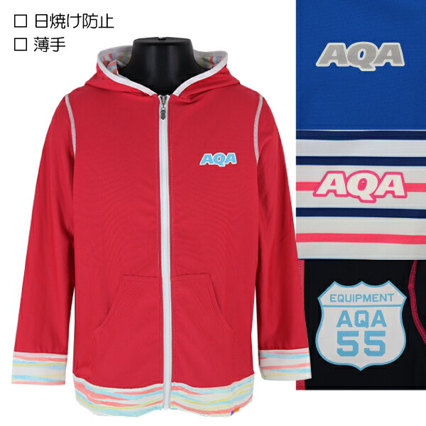AQA フード付き ラッシュガード 日焼防止 薄手 水着 子供 キッズ 長袖 フルジップ 4柄 90-150cm 入園 入学 通園 通学【送料無料】