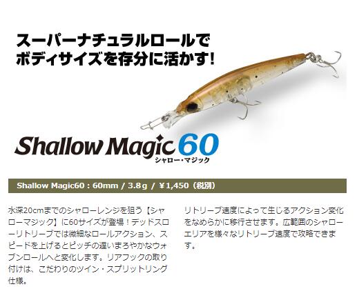 水深20cmまでのシャローレンジを狙う【シャローマジック】に60サイズが登場! デッドスローリトリーブでは微細なロールアクション、スピードを上げるとピッチの遅いまろやかなウォブンロールへと変化します。 リアフックの取り付けは、こだわりのツイン・スプリットリング仕様。 リトリーブ速度によって生じるアクション変化をなめらかに移行させます。 広範囲のシャローエリアを様々なリトリーブ速度で攻略できます。 こんなギフトシーンに 1月お年賀 寒中見舞い お年玉 年始 挨拶 成人祝い 2月バレンタイン 合格祈願 マラソン 3月ホワイトデー プチギフト ひなまつり 春休み 卒業式 合格祝い 卒業祝い 引っ越し祝い 退職 花見 4月入学式 入学祝い 新生活 就職祝い 5月母の日 こどもの日 ゴールデンウィーク 6月梅雨 ジューンブライド 7月夏休み お中元 キャンプ 8月暑中 残暑見舞い 盆休み お盆玉 手土産 夏祭り 9月敬老の日 お彼岸 10月ハロウィン 発表会 運動会 体育祭 11月七五三 文化祭 夫婦の日 12月クリスマス 年末 年越し お歳暮 冬休み 福袋 帰省 誕生日 バースデー プレゼント ギフト 記念日 贈り物 結婚祝い 出産祝い お返し 内祝い 開店祝い 還暦祝い お祝い 昇進祝い 餞別 お見舞い釣りのお供におすすめ! 商品説明
