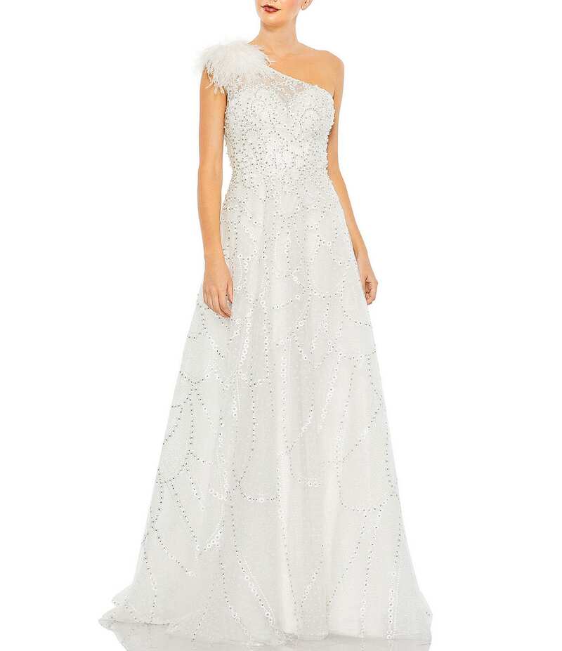 マックダガル レディース トップス ワンピース A ライン アシンメトリー ノースリーブ Mac Duggal Embellished Asymmetrical Neck Sleeveless Feather Shoulder A-Line Gown Ivory アイボリー