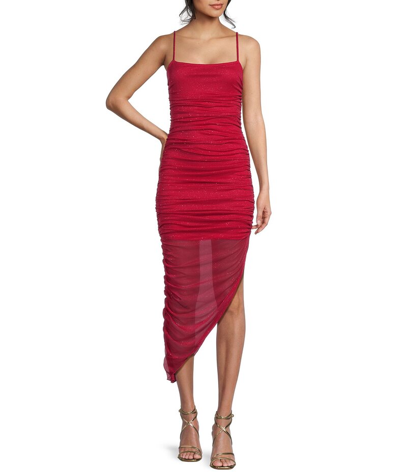 ジャンプ レディース トップス ワンピース アシンメトリー ボディコンワンピース ギャザー Jump Glitter Ruched Asymmetrical Hem Bodycon Dress Red レッド