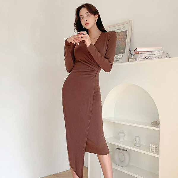 【レビュープレゼント付!】ニットワンピース レディース キレイめ ワンピース タイトワンピース ドレスワンピース 韓国 風 長袖 インポート きれいめ オフィススーツ 茶色 ブラウン シンプル タイト 着痩せ お呼ばれ ミドル丈 パーティドレス 上品 通勤 キャバ