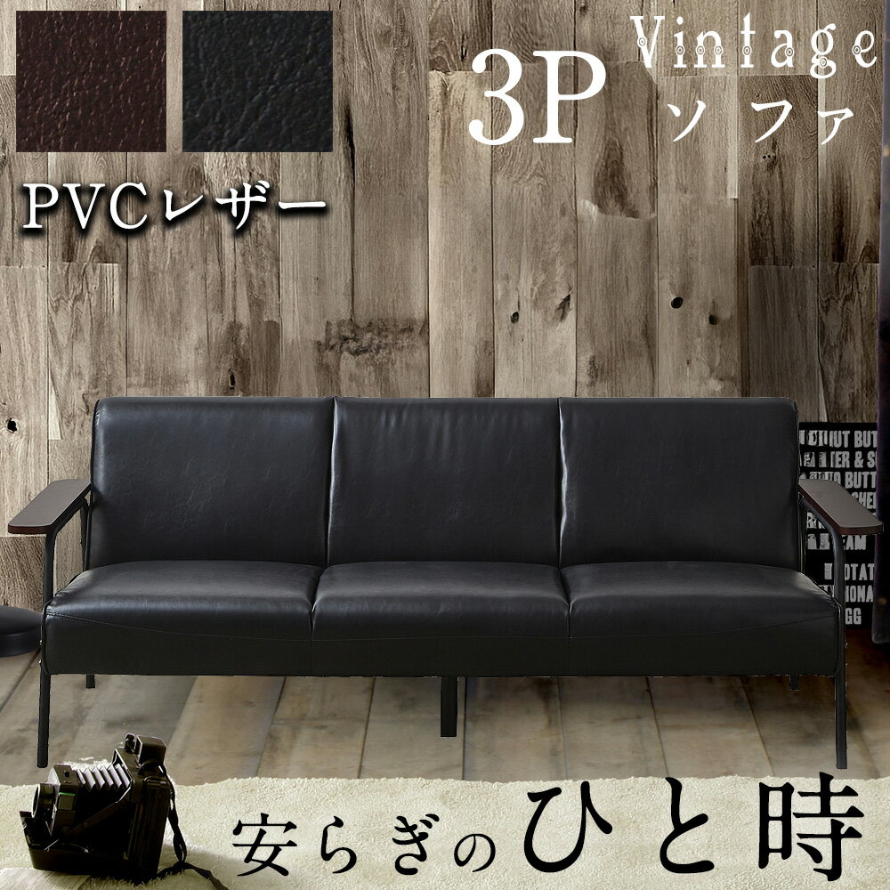▼[1日限定]先着20名限定15%OFFクーポン ソファ 3Pソファ 3人用 三人用 3人掛け 幅190cm ヴィンテージ風 北欧風 ヴィンテージ加工 レザー 革 黒色 茶色 スチール脚 木製肘 おしゃれ ヴィンテージソファ オススメ おすすめ 新生活 30代 高級 アンティ