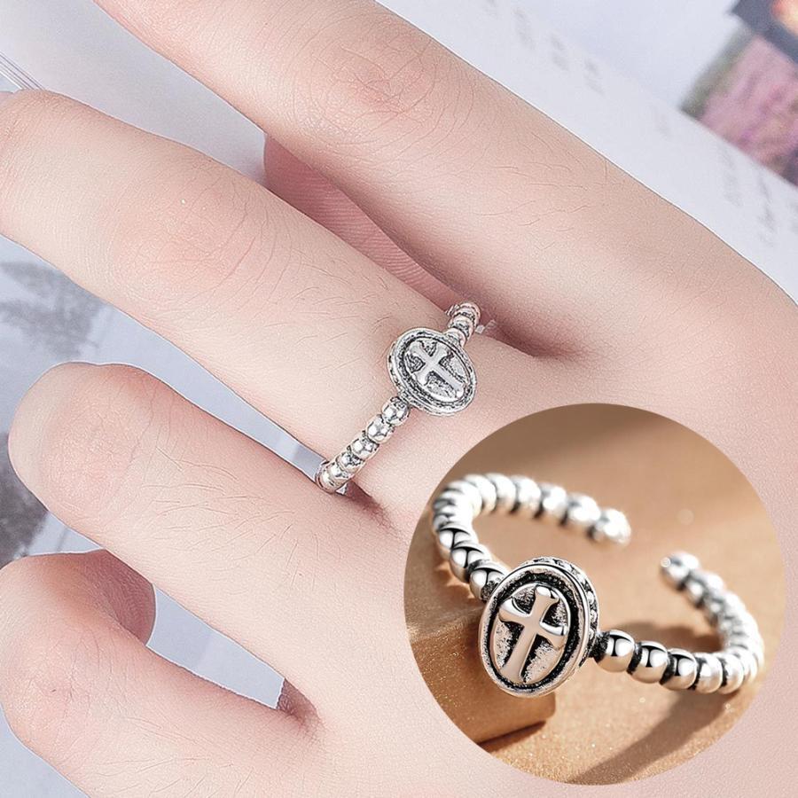 オープンリング 指輪 レディース アクセサリー 女性用 クロス 十字架 ヴィンテージ調 レトロ ボールチェーン風 おしゃれ かわいい 復古調 アンティ