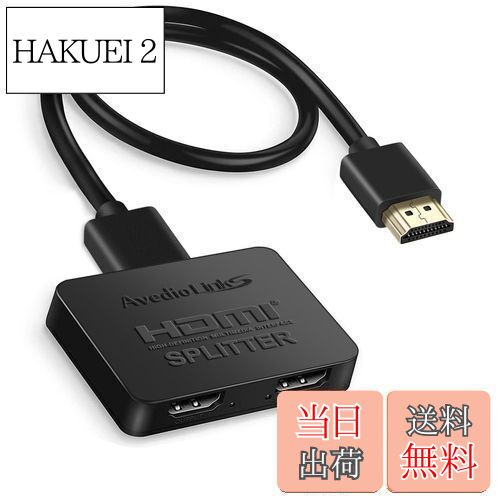 商品情報商品の説明主な仕様 【? HDMI 分配器 同時出力】avedio links HDMI スプリッター 1入力2出力は、2つの画面で同じ出力を複製するように設計されています-【複製するだけで、2つの異なる出力は提供されません】4K HDMI 分配器は、1つのHDMIソース(コンピューターなど)を2つの出力に接続できます (そのような:テレビ、プロジェクター、モニター)、そして両方の出力は同じページを表示します。あなたはビデオとオーディオを同時に、損失なしで、遅れなしで得るでしょう。br【? 4K HDMI 分配器&高速USBケーブル付き】: 1入力2出力HDMI 分配器は、最大4K 30HZ、2k @ 60hz、1080p @ 120hz、3D、1080Pの解像度をサポートします。HDMI入力、出力が4K、HDMIケーブルが高品質の場合、両方のモニターがすべて4Kで動作します。 両方のモニターが同期していて、色の深さがまったく変わらないため、遅れはありません。豪華なビデオとオーディオを友人や家族と共有できます。HDMI出力ケーブルを使用してください。【複製するだけで、2つの異なる出力は提供されません】br【? 幅広い互換性】: HDMI スプリッターは1つの入力をサポートします:Sky Box、Fire Stick、Computer、XBox 360、XBox、PS3/PS4/PS4 Pro/PS5、Fire TV Stick、Blu-RayDVDプレーヤーなどに適用。同時に2つの同じ出力をサポートします:TV、プロジェクト、モニターなどに適用【注意:このHDMI 分配器 1X2は、サウンドバー、アンプ、ヘッドフォン、またはhdmiポートを備えたその他のオーディオデバイスの接続をサポートしていません。HDMIオーディオスプリッターではありません。】br【? プラグアンドプレイ&ポータブル】: HDMI SPLITTERデバイスとUSB充電ケーブルを接続するだけでお楽しみいただけます。サイズ:2.5x2.1x0.5インチ/ 6.3X5.3X1.2 cm、HDMIスプリッター1入力2出力は使いやすく、持ち運びが簡単で、旅行に便利です。 小さなスプリッターボックスを接続すると、リビングルームとキッチンの間で2つの同じディスプレイを共有できます。学校、ソーシャルクラブ、家族で非常に便利です。外部ドライバーが不要で、安全で環境に優しいです。br【パッケージの内容】:1 * HDMIスプリッター+ 1 * 高速HDMIケーブル+ 1 *USB電源ケーブル+ 1 *取扱説明書。