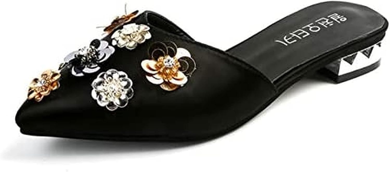 ポインテッドトゥ フラワー ミュール サンダル かかとなし パンプス 旅行 疲れにくい 前ふさがり サボ バブーシュ 走れる 婦人靴 サテン 大きいサイズ チャンキーヒール 履き心地良い スリッパ