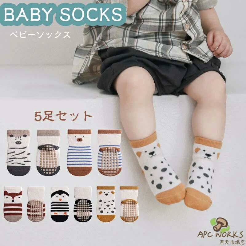 ベビー用 靴下 5足セット ベビー セット ベビーソックス 滑り止め付き アニマル 北欧風 キッズ ソックス 暖かい 春 夏 冬 秋 防寒 男の子 女の子 可愛い かわいい 赤ちゃん 保育園 動物 カジュアル babysocks ギフト お祝い