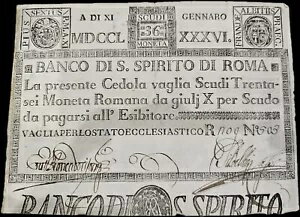 1786 イタリア教皇領 36 Scudi Banco Di S. Spirito Di Roma 素晴らしい条件