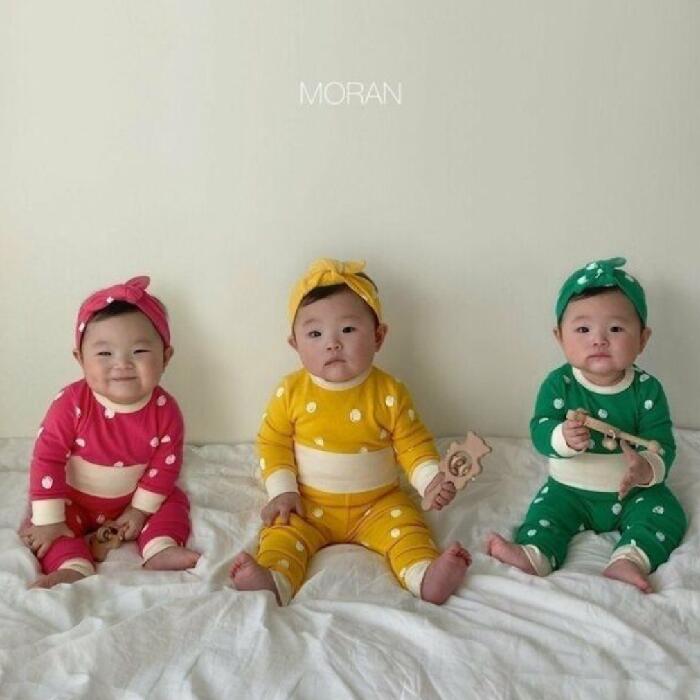 ドット ロンパース パンツ ヘアバンド セット レッド グリーン イエロー 3点セット セットアップ カバーオール つなぎ ズボン 長袖 水玉 赤 緑 黄色 子供服 こども服 こどもふく 韓国子供服 70cm ベビー服 赤ちゃん ベビー キッズ 男の子 女の子 可愛い お洒落 春 夏 秋 冬