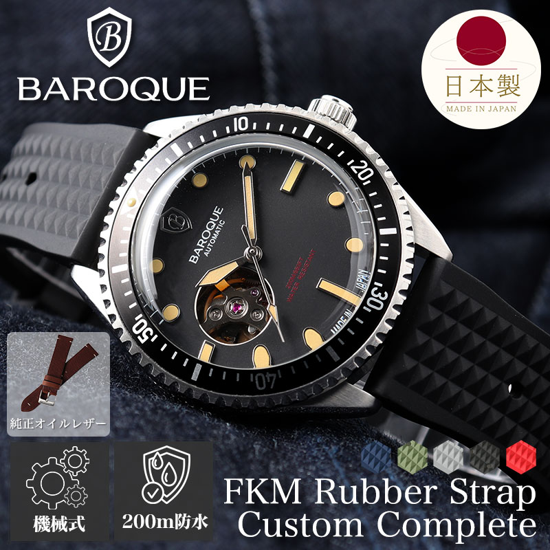【ブラックフライデー限定!300円OFFクーポン付!】バロック 腕時計 BAROQUE 時計 日本製 機械式 自動巻き 黒文字盤 国産 メカニカル ダイバー 200m 防水 メンズ 男性向け オープンハート シースルーバック ラバーベルト オイルレザー ベルト ヴィンテージ ドーム風防 人気