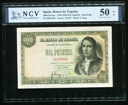 tu_bazar BILLETE 1000 PESETAS 1949 NO SERIES 06072630 EBC about uncirculated-商品について注意事項※以下の注意事項をご理解のうえ、ご購入ください■ 鑑定済みコイン・紙幣について各種コイン・紙幣の鑑定機関(NGC、PCGS、PMGなど)は、収集品の真贋鑑定およびグレーディングを行う専門機関です。鑑定後の商品は、専用ケース(スラブ)に封入され、状態を示すグレードが付与されます。■ グレードについてグレードはコイン・紙幣自体の状態を評価するものであり、ケース自体の品質や状態を保証するものではありません。製造・輸送時の影響により、以下のような状態が発生する場合がございます。- 軽微なスレ傷・拭き傷(特に光の角度で見えるもの)- ケース内部のホコリ・小さな異物(鑑定機関の検品基準を満たしている場合)- ラベルのズレ・わずかな傾きこれらは鑑定機関の基準内であり、返品・交換の対象とはなりませんのでご了承ください。■ ラベルの種類について各鑑定機関では、コイン・紙幣の状態や鑑定の結果に応じて異なるラベルが付与されます。- 通常ラベル(Standard/Regular):一般的なグレード付き鑑定済みコイン・紙幣- オーセンティック(Authentic):グレードなしで真贋のみ保証- 詳細グレード(Details):クリーニング跡やエッジのダメージがあるが本物と認定- 特別ラベル(Special Label):記念版や特定のデザインの限定ラベル - 例:NGC「Early Releases」「First Releases」、PCGS「First Strike」 などグレードやラベルの種類は、商品画像および説明文をご確認のうえ、ご購入ください。■ 在庫状況について当店の商品は海外から取り寄せております。ご購入のタイミングによっては在庫切れとなる場合がございます。その際はご連絡のうえ、ご注文をキャンセルさせていただく場合がございますので、あらかじめご了承ください。■ ご注文後のキャンセルについてご注文と同時に商品のお取り寄せを開始するため、お客様都合によるキャンセルは承っておりません。■ 配送についてお届けまでに通常2〜3週間ほどかかります。海外の祝日や天候、税関手続きにより通常より配送が遅れる可能性がございます。■ 保証について商品説明に英語で「保証(warranty)」と記載があっても、日本国内では適用されませんのでご了承ください。 当店では、商品到着後7日以内の初期不良に限り、対応させていただきます。 (返品規約の詳細については、楽天市場内の会社概要欄下部をご参照ください。)■ 商品の色・素材感について撮影環境やモニター設定により、実際の商品と色味や質感が異なる場合がございます。■ 価格変動について希少性の高い商品は市場価格の変動により、追加料金をお願いする場合がございます。追加料金に同意いただけない場合には、ご注文のキャンセルが可能ですので、ご安心ください。■ その他サービスについて海外製品の輸入代行も承っております。ショップに掲載されていない商品でもお探し可能ですので、お気軽にご相談ください。尚、業者販売(業販)や複数購入の場合、割引対応も可能です。ご希望の方はお問い合わせください。