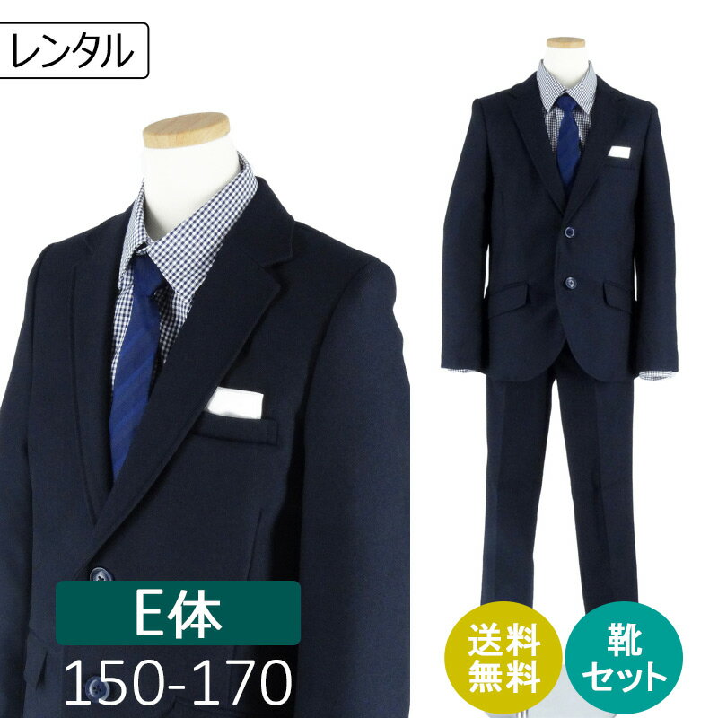 【レンタル】[E体]さらにゆったりサイズ 大きいサイズ 子供スーツ 男の子スーツレンタル 卒業式 スーツ 150cm 160cm 170cm 男児 紺2つ釦スーツセットオフホワイトシャツ 結婚式 貸衣装 靴セット 男の子 スーツ ジュニアスーツ 太め