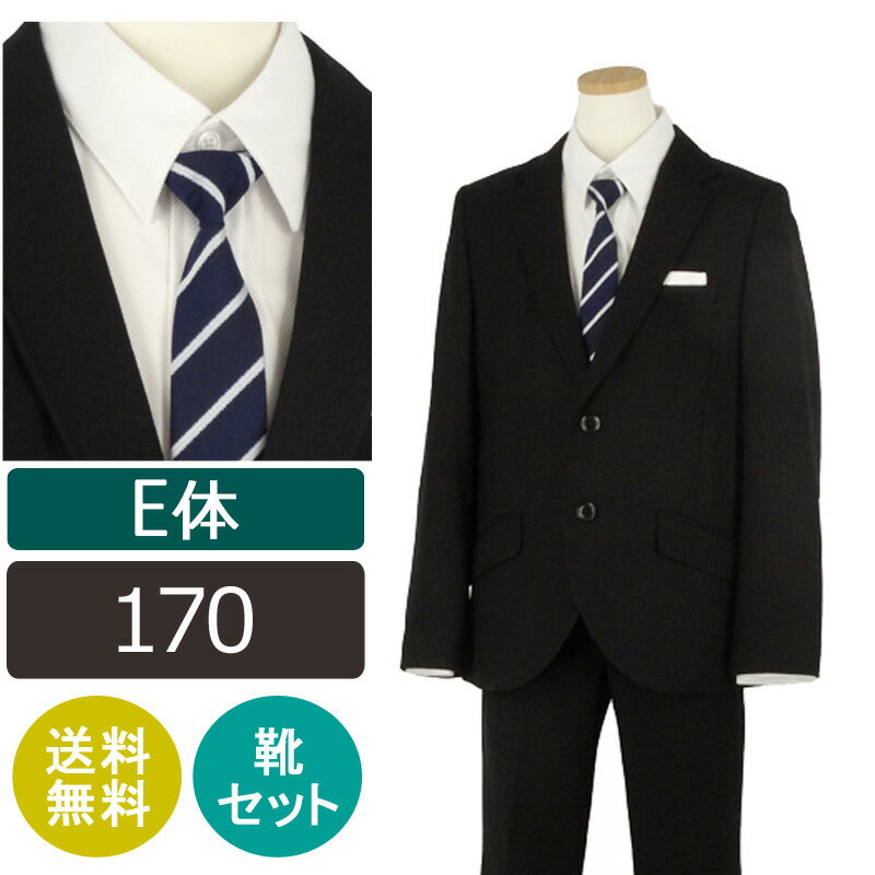 【レンタル】[E体]さらにゆったりサイズ 大きいサイズ 子供スーツ 男の子スーツレンタル 卒業式 スーツ 170cm 男児 黒地2つボタンスーツセットストライプシャツ 結婚式 貸衣装 靴セット 男の子 スーツ ジュニアスーツ 太め