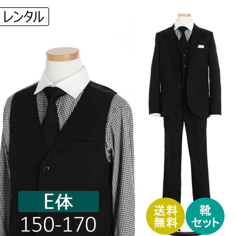 【レンタル】[E体]さらにゆったりサイズ 大きいサイズ 子供スーツ 男の子スーツレンタル 卒業式 スーツ 150cm 160cm 170cm 男児 黒 3ピーススーツセット ギンガムチェックシャツ ベスト ニットタイ 結婚式 貸衣装 靴セット 男の子 スーツ ジュニアスーツ 太め