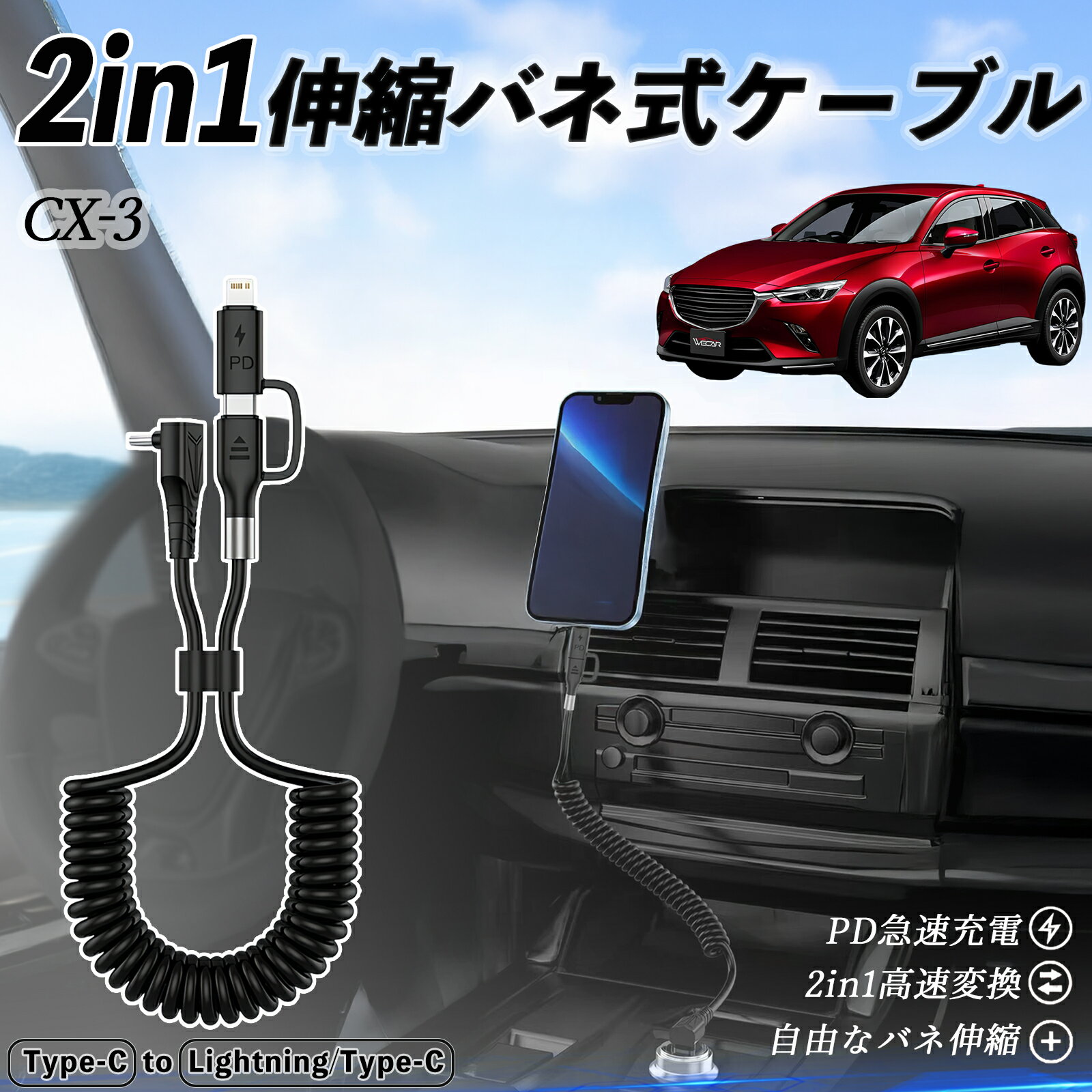 マツダ CX-3 2in1 USB-A USB-C ライトニングケーブル カールコード MFi認証 Apple Carplay Android Auto iPhone 充電ケーブル PD 27W/60W 急速充電 高速データ転送 伸縮 高耐久 ienobenrikan