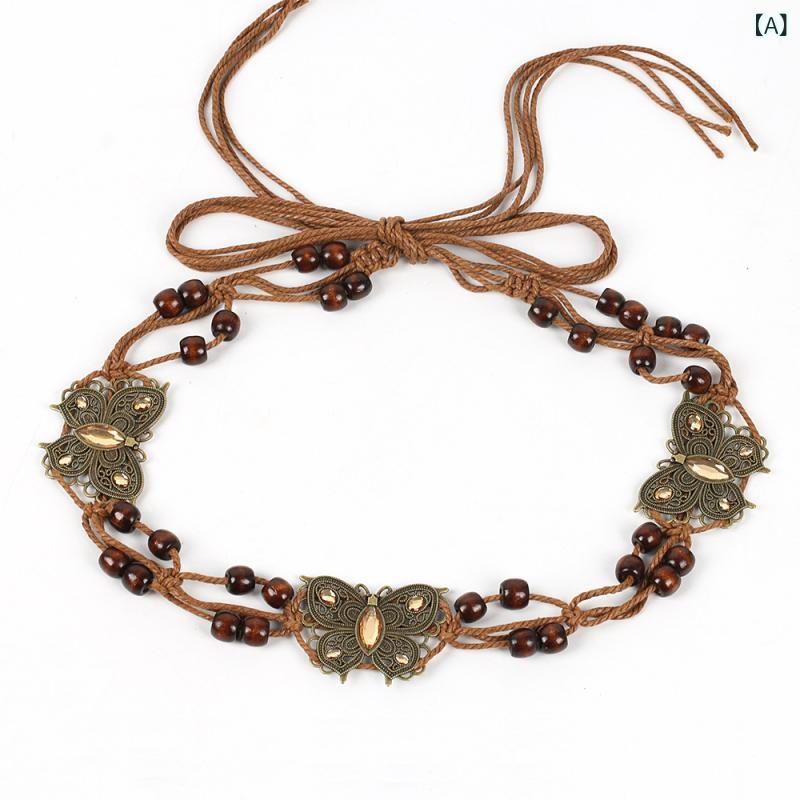 ウエストチェーン レディース 女性用 ボヘミアン エスニック 民族調 手編み ハンドメイド メタル 蝶 バタフライ ラインストーン ビーズ 装飾 紐ベルト ファッション小物