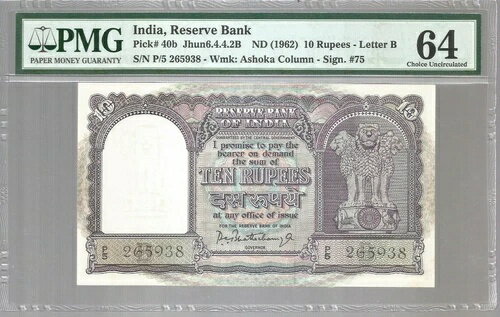インド 10 ルピー ND (1962) の標識。 PC Bhattacharya Pick-40b Choice UNC PMG 64