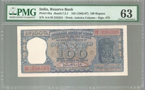インド 10 & 100 ルピー P-62A 1962-1970 PC Bhattacharya 署名
