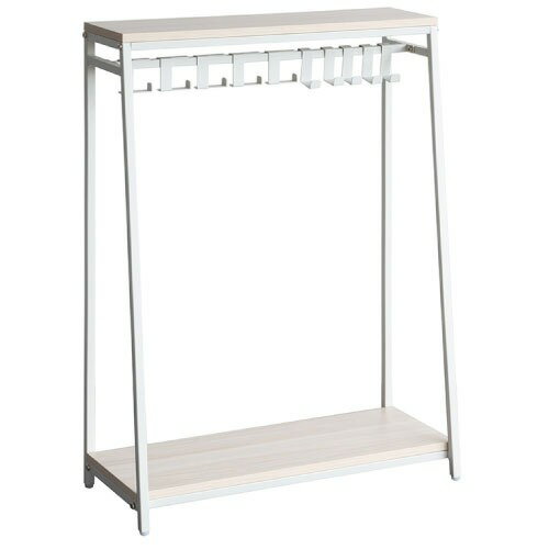 商品説明玄関や廊下の空いたスペースにカバンをまとめて置ける棚付きバッグハンガー『Mersa(メルサ)』。 カバンのデザインで掛ける向きが選べる2種類のフックが各5本、計10本付属。 上下にある木製棚に小物も置けます。 ランドセルも掛けられるので、お子さまにもオススメ。商品詳細□サイズ 幅60×奥行き25×高さ85cm □材質 PVC貼りMDF、スチール(粉体塗装) □耐荷重 バー全体:5kg 上棚:5kg 下棚10kg □備考 フック10本付き 組立式(約20分)