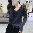 レディース シャツ レース シルク 春秋 薄手 ベルベットの 韓国 レース メッシュ スプライシング Tシャツ ファッション ホット ラインストーン Vネック レイヤリング シャツ 女性 西洋風 インナーウェア