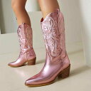 ブーツ レディース 女性用 欧米レトロ クラシック シルバー 刺繡 ポインテッドトゥ チャンキーヒール ミドル丈 ウエスタンブーツ プルオン 着脱簡単 普段使い お洒落