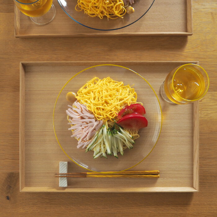サイズ(目安) φ23.5×H2.2cm 重量(目安) 462g 材質 ソーダガラス 使用区分 食洗機 ○、電子レンジ ×、オーブン × 原産国 フランス 加工:日本 ■ご確認ください ●ガラス製品は、製造上どうしてもできてしまうポッチや小さな傷、色ムラやヨレ、気泡、ライン状のシワ、多少のぐらつきが見られる場合がございます。 ●縁のラインは1点づつ手作業で施しているため、線の太さや色(右の画像)などに個体差があります。またかすれがある場合もございます。 ●お使いのPC・携帯等端末の環境により、実際の製品と画像の色味が若干異なる場合がございます。予めご了承ください。 ※ラッピングをご希望の方はこちらをご覧ください。ポトペリー ビッテ プレート 23.5cm イエロー / POTPURRI bitte 鮮やかなラインが目を引くおしゃれなガラス食器 東京、清澄白河に店舗を構えるポトペリー(POTPURRI)から届いた 軽やかなガラスのテーブルウェアをご紹介いたします。 目の覚めるような鮮やかな黄色と ブルーのラインで縁取りされたビッテ(bitte)シリーズは、 業務用ガラスウェアを手がける 老舗ブランド・デュラレックス(DURALEX)などの 食器をベースにポトペリーがカラーデザインを担当したオリジナル品。ビッテ(bitte)とは、スウェーデン語で 「朝早く」を意味し、透明な日差しが気持ち良い 初夏の朝をイメージしてデザインされています。縁の色つけ作業は東京、森下の工場で一点一点手書きで行われています。 そのため、色の濃淡、太さ、かすれ具合に個体差がありますが、 やや画一的な印象を受ける業務用の食器に、 手書きのラインがスーッと載ることで手仕事の温もりがプラス。 一つずつ異なる表情に愛着が湧いていきます。 食品衛生法に適合した安全性の高い絵の具を使用。 また、色落ちしにくいように配合されているため、 その鮮やかな色合いを長く楽しむことができるのは嬉しいポイントです。23.5cmプレートは冷やし中華、ミニトマトのカッペリーニ、 レタス炒飯などのメイン料理に (ちなみにスタッフの間ではエスニック料理と 相性が良さそうとの声が集まりました)。 中央部分を意識して盛り付けると、 リムの余白が生きてきておしゃれな一皿が完成します。 撮影時に料理を盛り付けてみたところ、 その良さが何倍にも引き立つことに驚きました。 料理の色合いやメニューによってガラスの煌めき方が変わり、 縁のラインが全体をきゅっとまとめる役割を。 下に敷くテーブルクロスなどにもこだわると 印象がガラリと変わりますし、 アンダープレートを取り入れても ガラスの重なりで奥行き感が生まれます。 普段使いはもちろん、食卓に華を添えたい おもてなしのシーンでも輝いてくれそうな予感です。 電子レンジ対応ではないものの、食洗機OK。 スタッキングが可能でサイズや形状も豊富な上に 価格も手頃だから、夏だけでなく季節を問わず その豊かな表情で食卓を彩ってくれることでしょう。