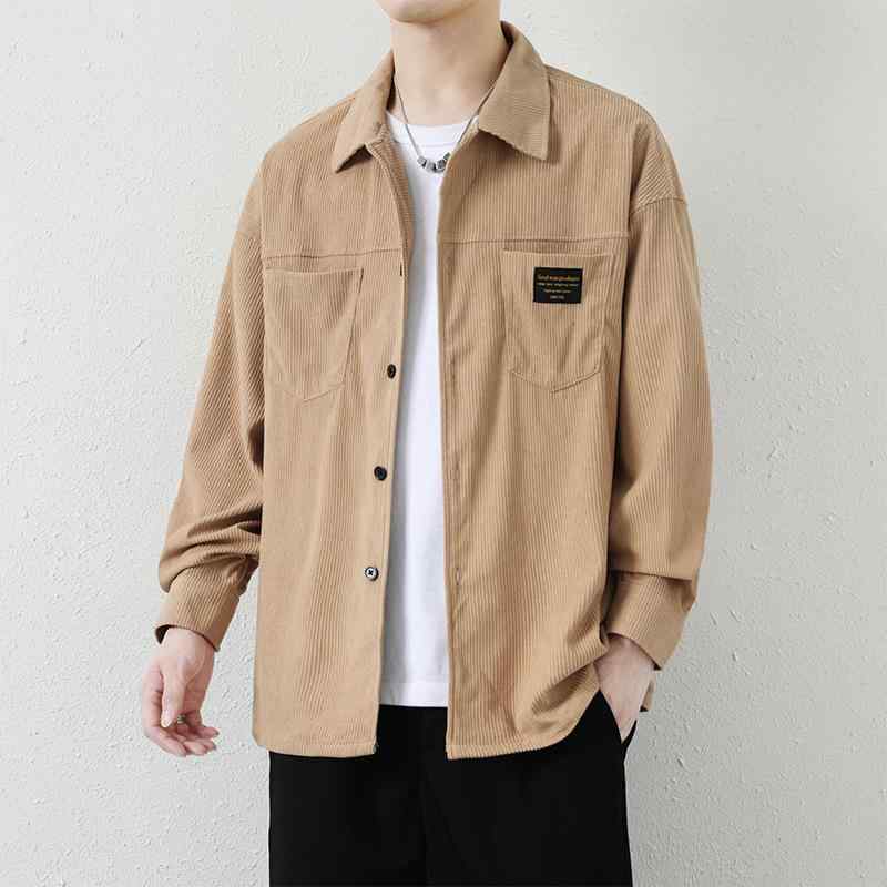 ・カテゴリ: シャツ・スタイル: 韓国風・主な素材: ポリエステル100%・生地: コーデュロイ・襟型: 襟付き・袖丈: 長袖・柄: 無地・カラー展開: ブラック、ミリタリーグリーン、カーキ・サイズ展開: M、L、XL、XXL、XXXL・デザイン: 前開き・フィット: ルーズフィット・厚さ: 普通・機能: 耐摩耗・素材番手: 20番手・ディテール: ジャカード織り・対象: 大人・性別: メンズ・着用シーン: カジュアル・シーズン: 春秋・加工: アイロン不要
