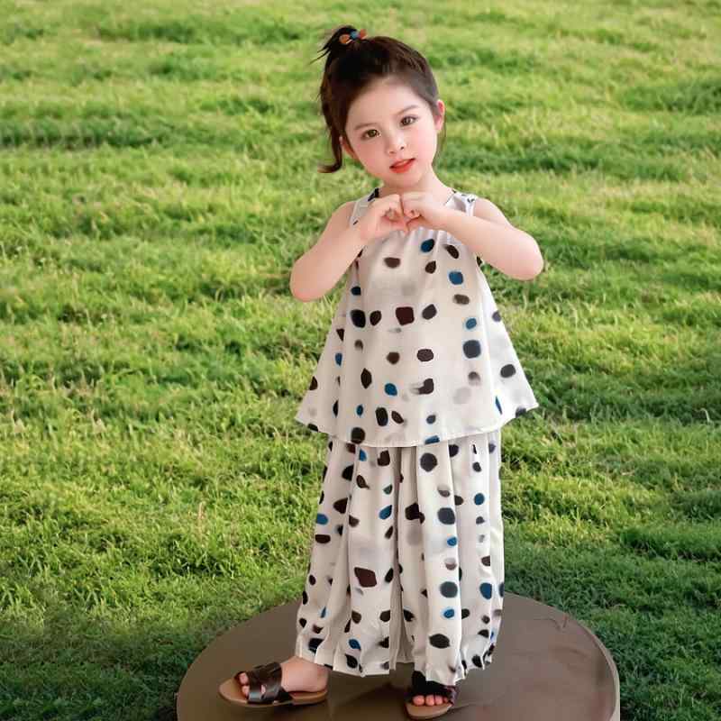キッズ 女の子 おしゃれ かわいい ドット柄 シフォン フリル ベスト パンツ セットアップ 夏物 カジュアル アプリコットカラー