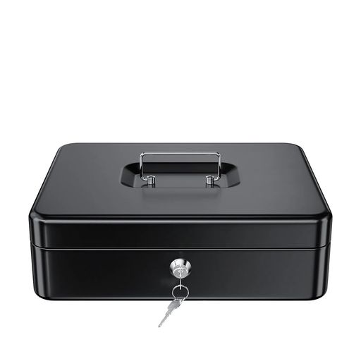 Point1「本体仕様書」「本体材質」鉄合金で、強く耐久性に優れる保管手提げ金庫です。「サイズ/重量」幅30cm*奥行き24cm*高さ9cm/1.65kg Point2【スタイリッシュな見た目】高級感のあるブラックカラー、高品質かつ頑丈なスチール製のボディ、置き場所を選ばないシンプルデザイン、ご家庭やオフィス、お店等の場所どこにでもなじむやさしいです。コイントレー、紙幣が折らずに入る収納スペース、またスチール製の取っ手つき、抜ける可能性はありません!持ち運び易くで移動する際には便利です。 Point3【簡単に解錠&施錠ができたキーロック錠】独自の番号を持つ鍵二本付きで、防犯効果UP。鍵で扉が簡単に開くため誰だも楽に操作でき、店舗などでの忙しい現金管理に便利です。二本の鍵ついているので、また各貯金箱の鍵はユニークで(鍵はどの手提げ金庫でも共通ではない)落とさないようにしてくださいね。 Point4【多彩なニーズに応える上段トレイと下段設計】本体サイズにあわせて設定された上段トレイは、硬貨収納用と、壱万円紙幣を折らずに収納できる、鍵やジュエリー用の5つのコンパートメントがあります。