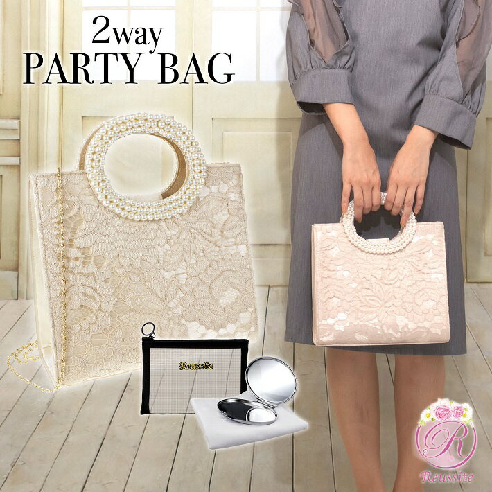 Reussite レユシット パーティーバック 結婚式 バッグ 大きめ 2way レース レディース ハンドバッグ ショルダーバッグ 披露宴 お呼ばれ マグネット 内ポケット 長財布 ベージュ 大容量 パール パンツスタイル /パーティーバッグ Perle bouque