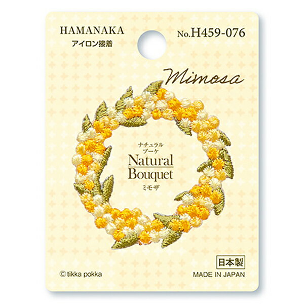 ワッペン 『Natural Bouquet (ナチュラルブーケ) ミモザ H459-076』 Hamanaka ハマナカ ワンポイントに♪リース・花束デザインのワッペン 今人気の花のモチーフを繊細で淡い色合いの刺しゅうで表現しました。 ミモザの花言葉 「優雅・友情・思いやり」 [ワッペン アップリケ アイロン オリジナル 刺繍 手作り ハンドメイド 入園 入学 保育園 幼稚園] ◆サイズ 本体:タテ約4.5cm×ヨコ約4.4cm 台紙:タテ約7.6cm×ヨコ約5.8cm ◆アイロン接着 ◆内容:1個入り ◆日本製 ※モニターによって実物のお色と若干異なる場合がございます。 【手芸用品・毛糸・生地の専門店 ユザワヤ】
