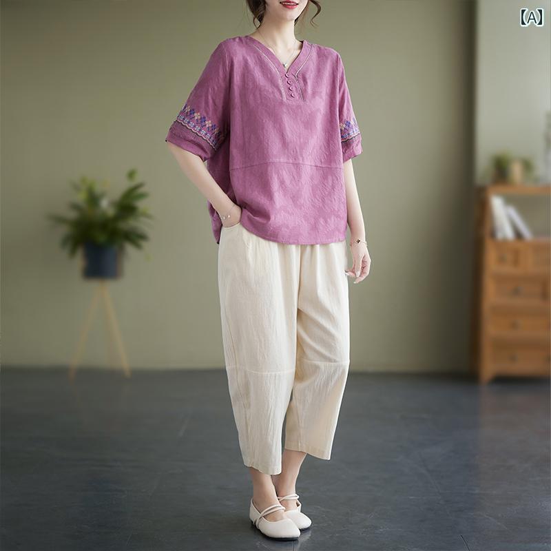 セットアップ レディース 夏 カジュアル おしゃれ 婦人服 普段使い エスニック 綿麻 大きめサイズ ゆったり カジュアル Vネック 半袖 Tシャツ
