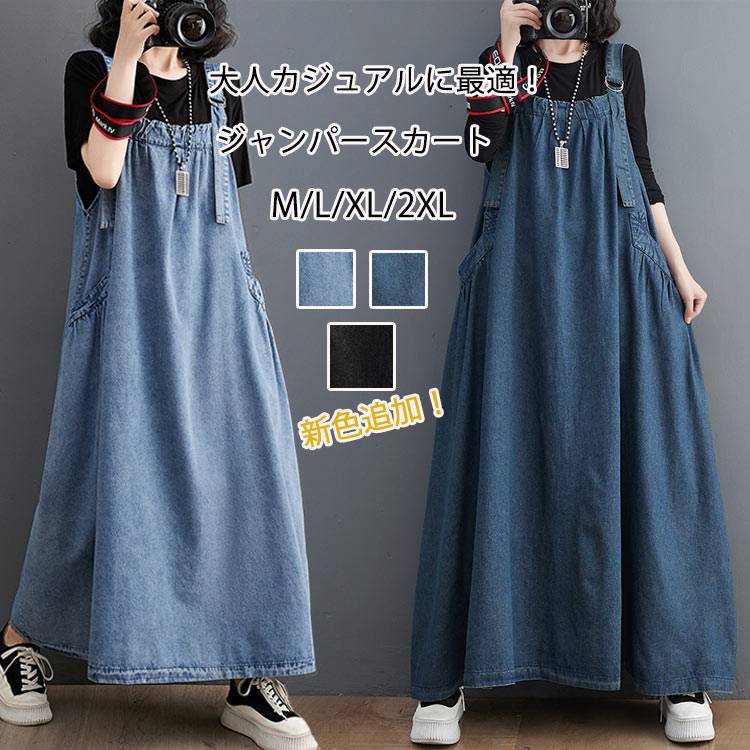 ジャンパースカート デニム デニムワンピース ロング マキシワンピース 春 秋 ロング丈 ジャンスカー サロペット 大きいサイズ デニムワンピ ポケット付き ワンピ オールインワン 体型カバー ゆったり Aライン