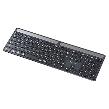 部屋の明かりで充電できる電池交換が不要なソーラーパネル内蔵Bluetoothキーボード。●ソーラーパネルを搭載したBluetoothキーボード●室内の照明でも充電できるので、電池交換や充電作業は不要です※1●蓄電用に電気二重層コンデンサ(スーパーキャパシタ)を使用。繰り返し充電に強くリチウムイオン電池に比べ長寿命です。●暗い環境でソーラーパネルに十分な光が当たらない場合でも動作する予備用ボタン電池を内蔵。ソーラー充電が完了すると自動的に電源が切り替わる設計です。●環境に配慮した80%再生プラスチックを使用。※2●キーストロークが浅く軽いタッチで入力できるパンタグラフキーを採用。●オフィスでも家庭でも使いやすいテンキー内蔵の標準配列●剛性が高く、キーの沈み込みが少なく心地よいタイピングが可能。●マルチOSに対応。Windows、Android、macOS、iOSなど様々な機器で使用できます。●最大3台機器を登録でき、ボタンを押すだけで機器の接続を変更できます。※1 充電には200lux以上の明るさが必要です。※2 キーボード筐体の素材に再生プラスチックを採用しています。キートップ及びその他の部品は再生プラスチックではありません。■キー数 : 113キー■キー配列 : 日本語■キースイッチ : パンタグラフ■キーピッチ : 19mm■キーストローク : 2.1±0.2mm■動作力 : 60g±20g■印刷方式 : シルク印刷■マルチペアリング : あり■使用電池 : 充電池ソーラー蓄電用 : スーパーキャパシタ補助用 : CR2032(ボタン電池)■充電時間 : 6時間500lux以上の明るさで充電した場合の目安です。充電には200lux以上の明るさが必要です。明るさにより充電時間は異なります。■連続動作時間 : 7時間ボタン電池での動作は47日■防水防塵規格 : なし■連続待機時間 : 72時間ボタン電池での待機時間は約2年■セット内容 : 取扱説明書、キーボード■対応機種 : Bluetoothモジュール内蔵のWindows搭載PC、タブレットmacOS搭載MacシリーズAndroid搭載スマートフォン、タブレットiOS搭載iPhoneシリーズ、iPadシリーズ■通信範囲 : 10m※使用環境によって異なります。■対応OS Windows : 11, 10■プロファイル : HID (Human Interface Device Profile)■適合規格 : Bluetooth 5.0 Class2■対応OS mac : macOS(Sequoia) 15、macOS(Sonoma) 14、macOS(Ventura) 13、macOS(Monterey) 12、macOS(BigSur) 11、macOS 10.12〜10.15■対応OS Android : Android 9〜14■対応OS iOS : iOS 11〜18※かな入力非対応■対応OS iPadOS : iPadOS 13〜17※かな入力非対応■接続方式 : Bluetooth■テンキー : あり■静音 : なし■アイソレーション : あり■タッチパッド : なし■スリムタイプ : スリムタイプ■キーボードサイズ : スタンダート■角度調節 : あり■抗菌加工 : なし■電源スイッチ : あり※ノートパソコンや各メーカー純正キーボードのファンクションキーにあらかじめ割り付けられている特殊機能(画面の明度調整やボリュームのアップダウンなど)は、このキーボードからは操作できません。※Windowsが起動する前のコマンド(BIOSの設定、SCSIボードの設定など)は使用できない場合があります。豆乳(入浴用化粧品)5個おまけつき(商品とは関係ありません)別送